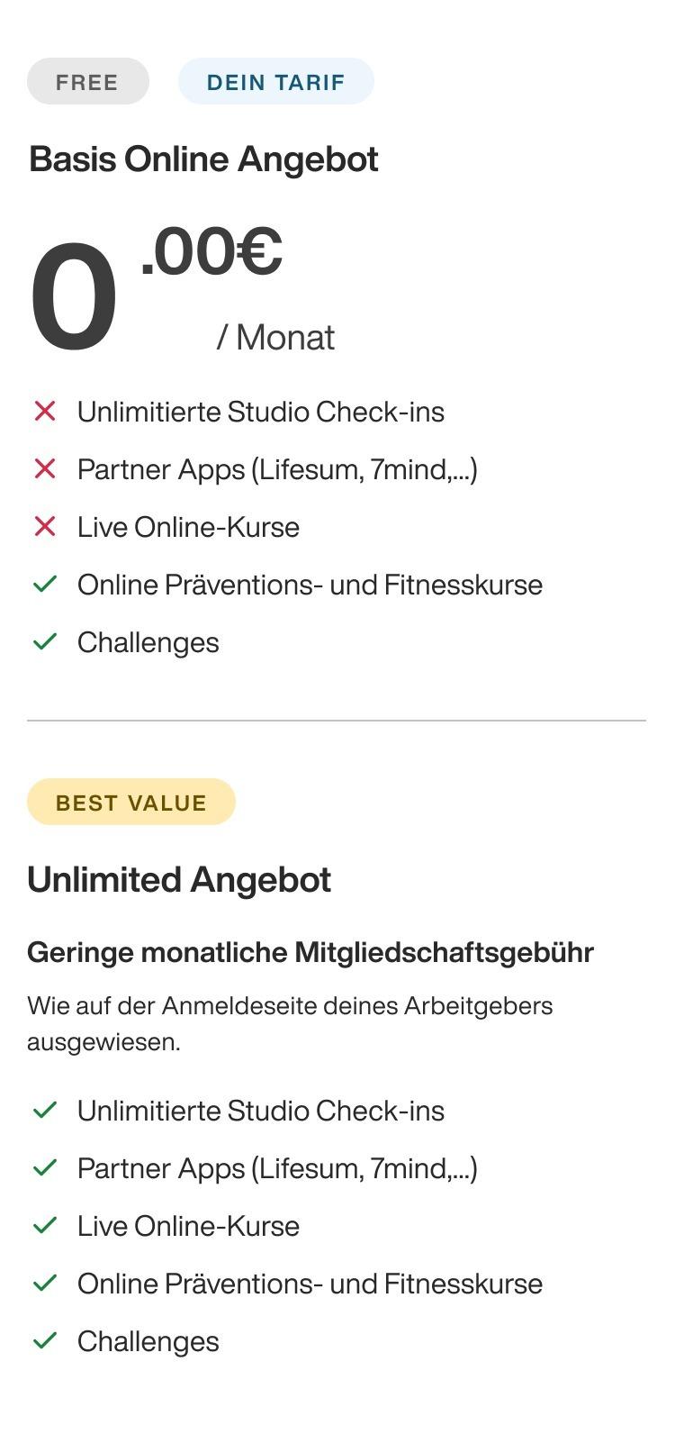Nur mit unserem Unlimited Angebot erhältst du Zugang zum gesamten Wellpass Studionetzwerk und zu weiteren digitalen Angeboten wie Live-Kursen und Partner Apps.